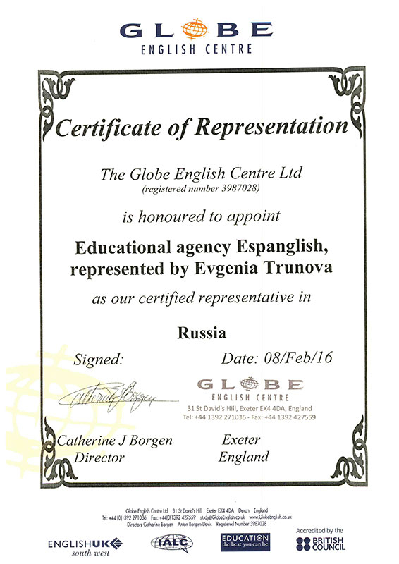Хочу поблагодарить, за профессиональную работу, менеджера Дарью Борисову. Она организовала моему сыну Константину 11 лет прекрасные каникулы в Англии Globe English Centre. Несмотря на кол-во моих звонков и длительную переписку, она во всех ситуациях была добра заботлива и уверенно спокойна. Огромное спасибо. Хочу продолжать сотрудничество. Сейчас выбираем с Дарьей школу на лето.