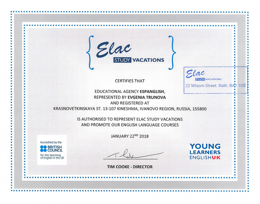 Elac имеет аккредитацию British Council с 2008 года. Он также является членом English UK и Young Learners English UK.