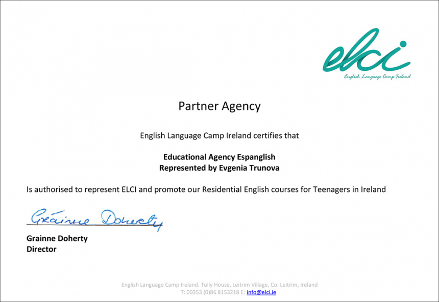 Основатели ELCI - Grainne Doherty и Niall Foley - дипломированные преподаватели английского языка, как иностранного. Они начинали свою карьеру учителями в летних лагерях в Великобритании. С тех пор они успели поработать и на крупные международные компании, преподавая английский сотрудникам FIAT, Iveco, Deutsche Bank, Intesa San Paolo и Santander. В 2011 году, имея за плечами огромный опыт и желание, а также же страсть к спорту и оздоровительному отдыху, они создали English Language Camp Ireland, организацию, которая на сегодняшний момент имеет безупречную репутацию в индустрии образования и огромное количество довольных студентов, возвращающихся сюда вновь и вновь.
