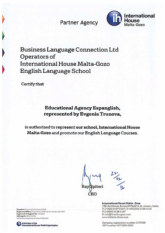 International House - крупная сеть языковых школ, расположенных по всему миру. Учебный центр на Мальте работает с 2001 года и является членом FELTOM. За долгое время работы, школа приобрела хорошую репутацию и разработала уникальные методики обучения английскому языку как иностранному.
