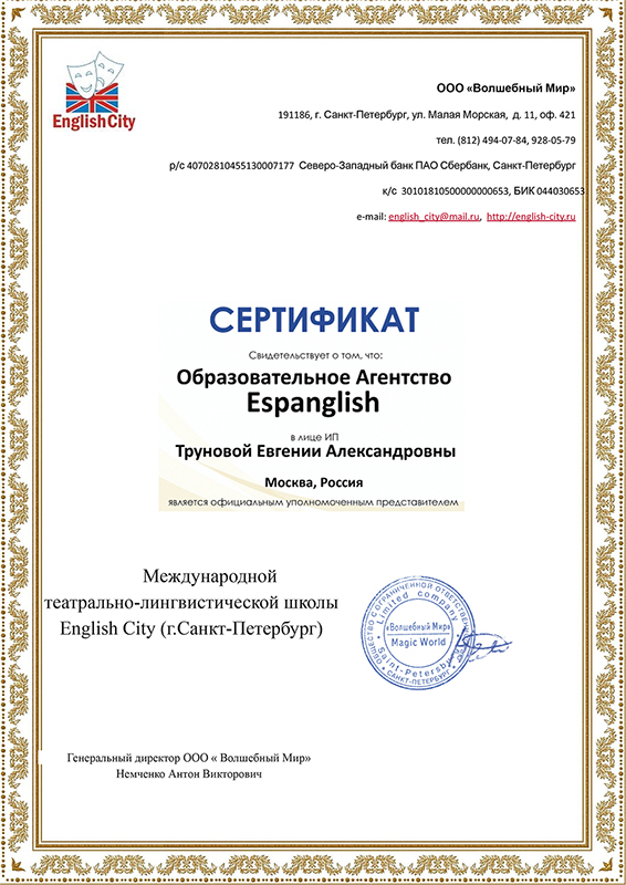 English City – международная театрально-лингвистическая школа, которая предлагает погружение в атмосферу кино и театра от ведущих представителей Российского Государственного Института Сценических Искусств (бывшая Театральная Академия на Моховой). Школа уже 14 лет помогает детям и взрослым подружиться с английским через творчество.