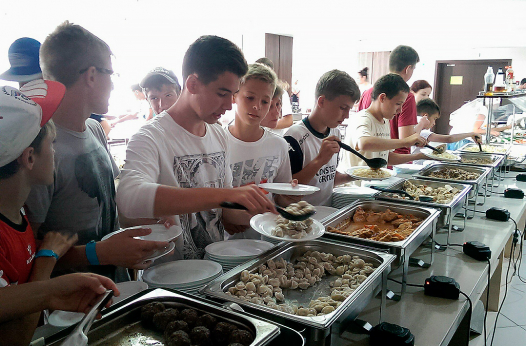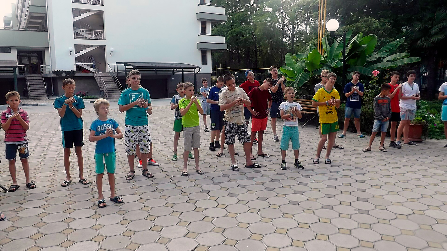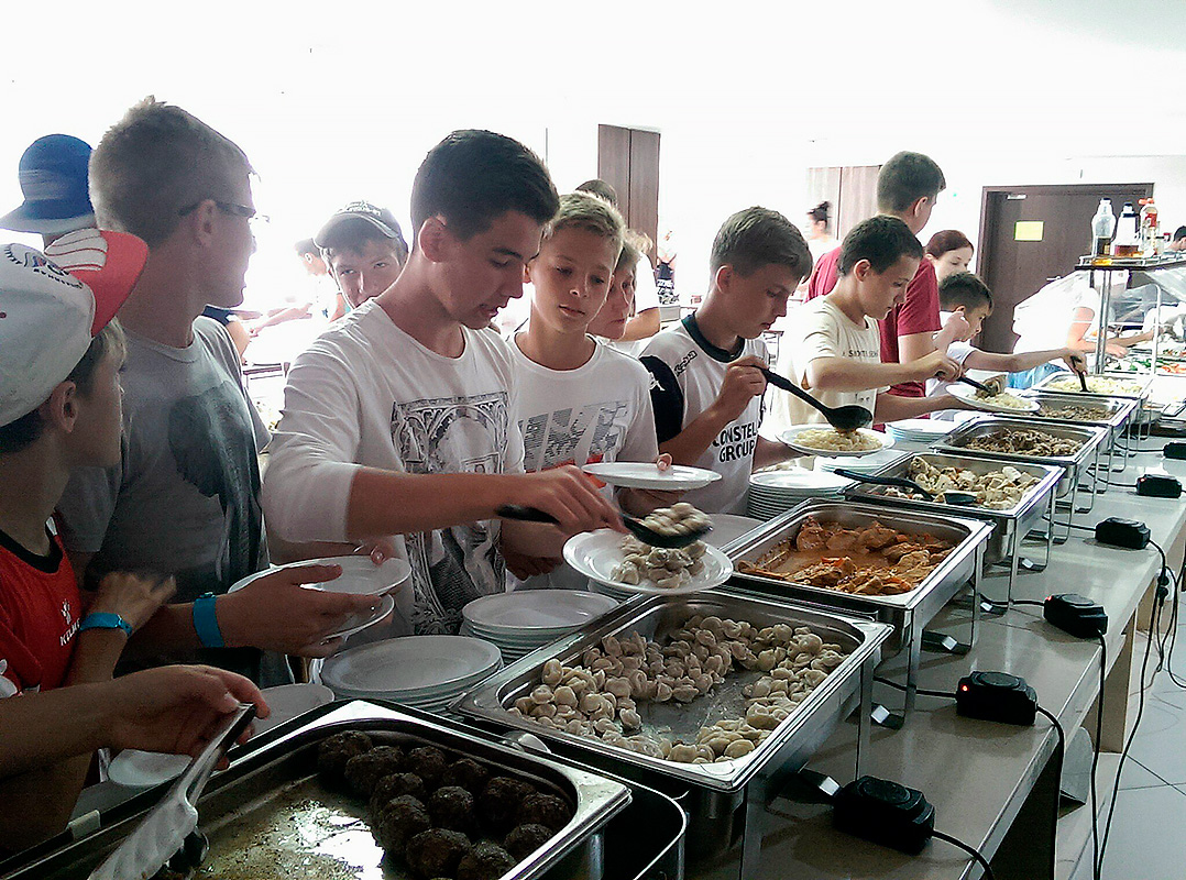 Ребята располагаются в 3-х местных номерах с удобствами, телевизором, холодильником, кондиционером. Питание осуществляется 3 раза в день по системе “шведский стол”.