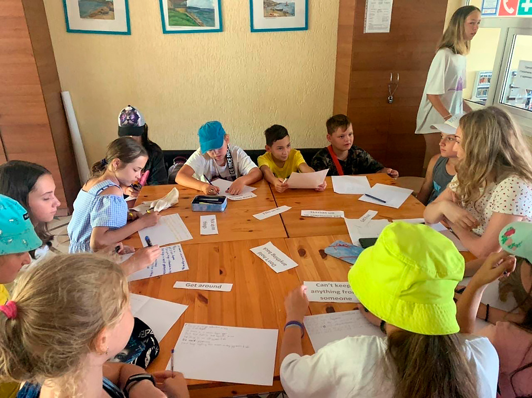 Занятия английским языком проходят в формате игр, также практика языка проводится во время мероприятий лагеря: мастер классов, творческих клубов, квестов, интерактивов, спортивных мероприятий. Ребята оттачивают свое актерское мастерство и принимают участие в постановках на английском языке. Дети учатся думать на английском, а также не бояться публики и работать в коллективе. Изучение языка проходит как с местными преподавателями, так и с носителями языка.
