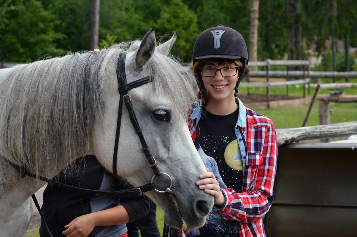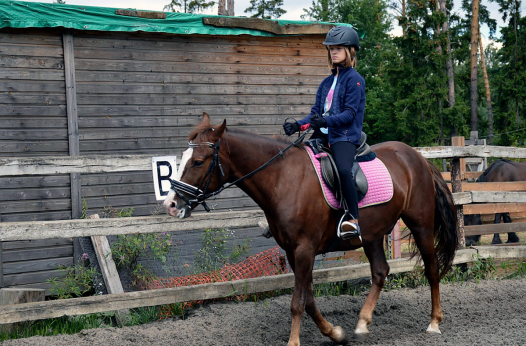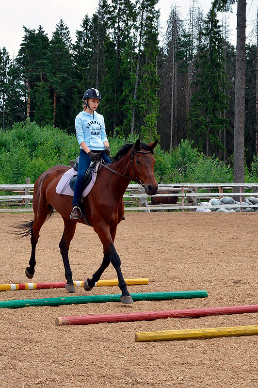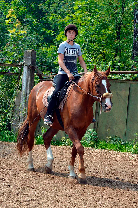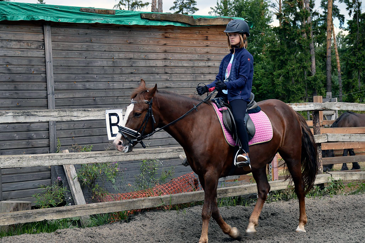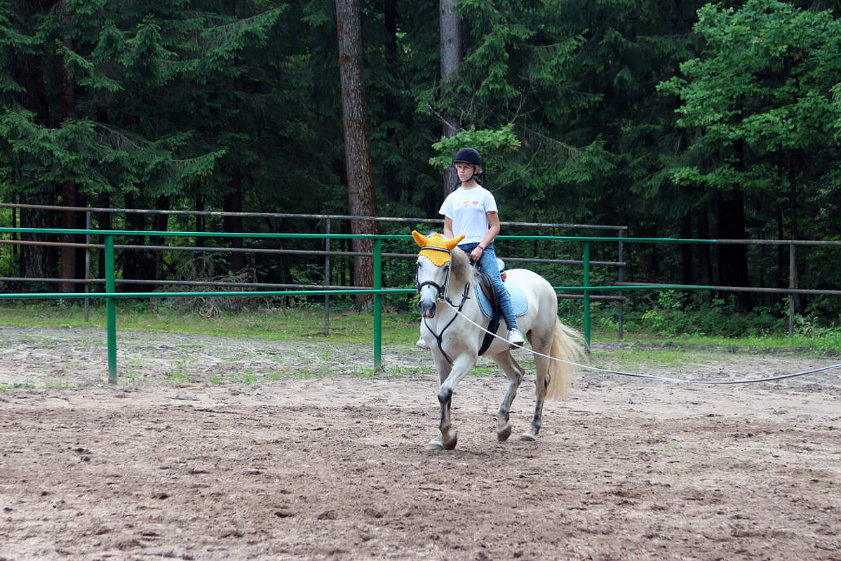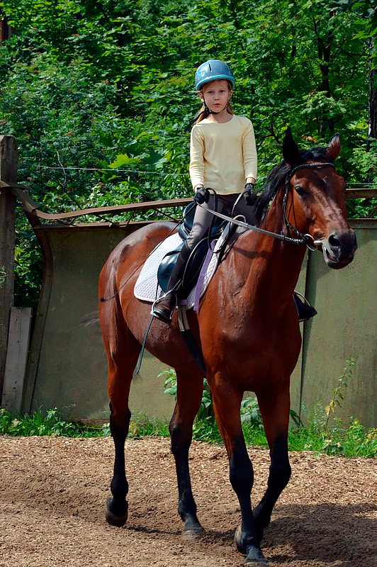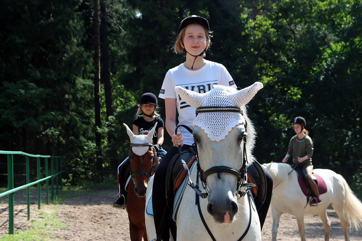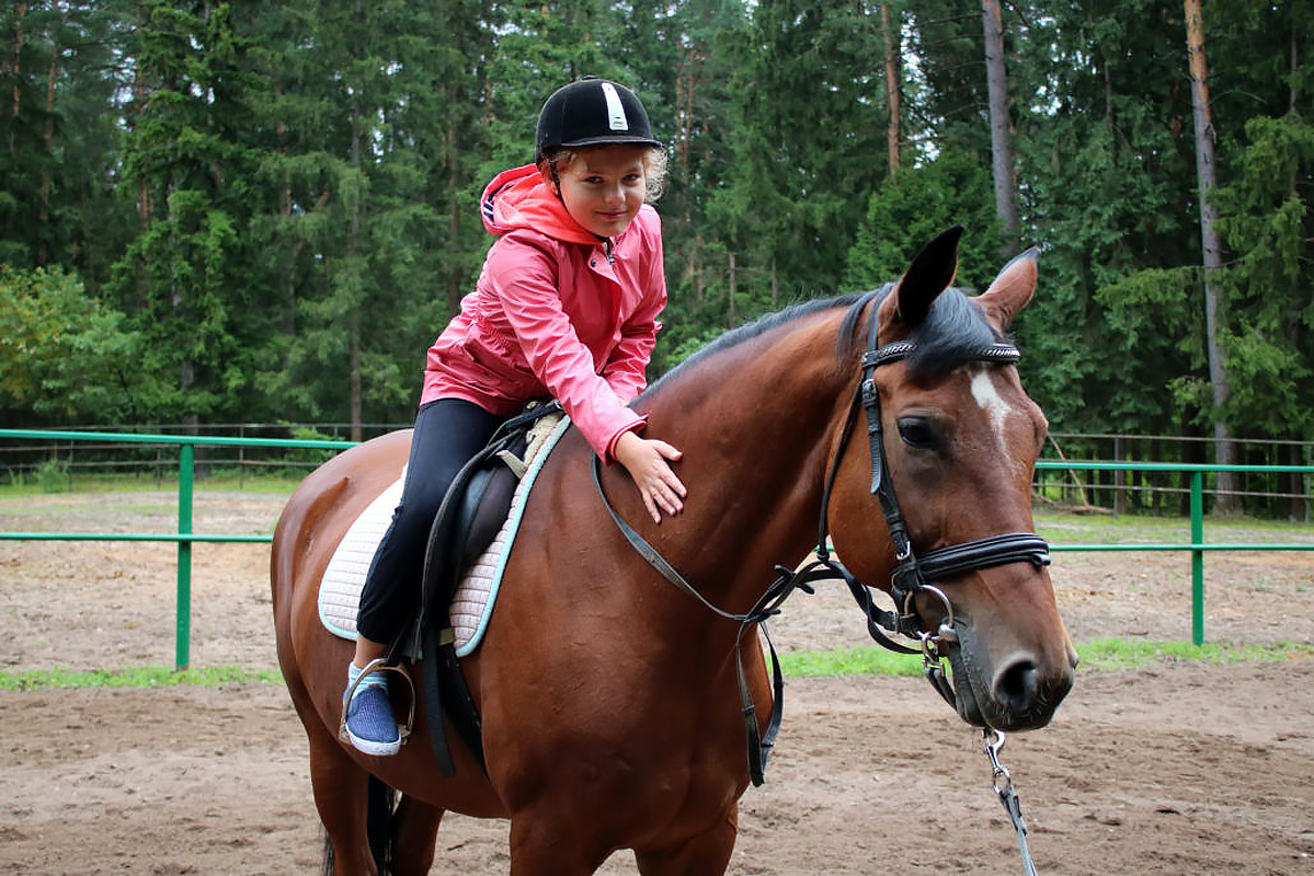 Программа верховой езды дает детям возможность освоить теорию и практику техник езды, узнать анатомию лошади, технику безопасности, ухода за лошадью, управление лошадью на ходу и многое другое. Верховая езда развивает координацию: вестибулярные реакции, ориентирование в пространстве, равновесие. Занятия проходят 5 раз в неделю по 1 часу.