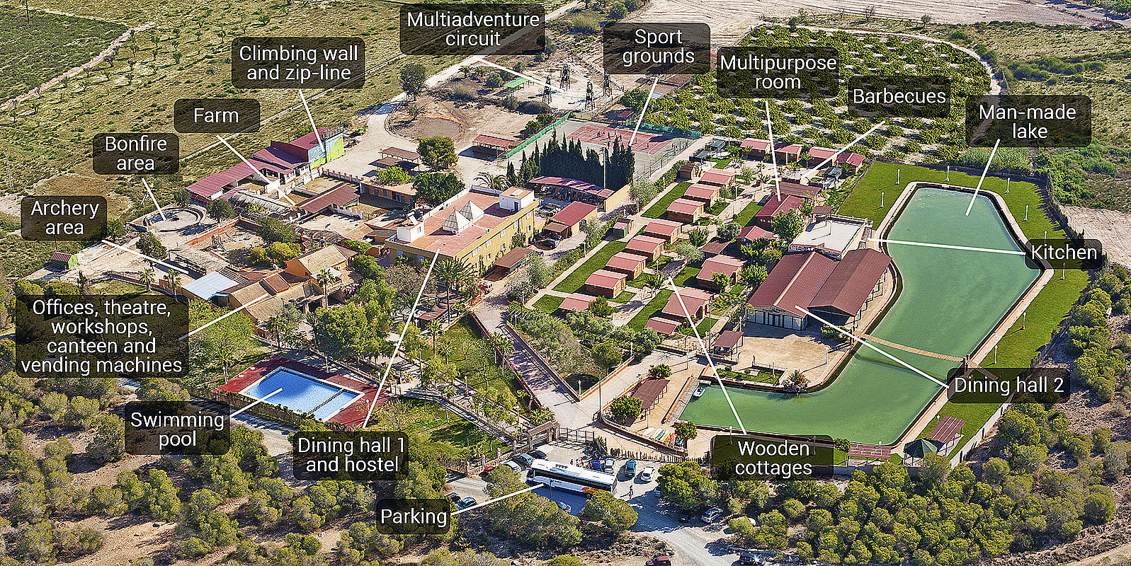 Инфраструктура лагеря была недавно полностью реконструирована и обновлена. Сейчас помимо обширной территории для участников летней программы доступны: основной корпус, десять деревянных коттеджей для расселения участников, обеденная зона с собственной кухней, плавательный бассейн, спортивный зал, просторная зона с игровыми площадками, искусственный водоем для водных мероприятий и спорта, актовый зал для концертов и шоу-программ, теннисные корты, площадки для футбола и баскетбола, сады с плодовыми деревьями и огромная ферма, где обитают более 400 особей домашних животных (козы, овцы, лошади, коровы, ослы, утки, куры и др.)