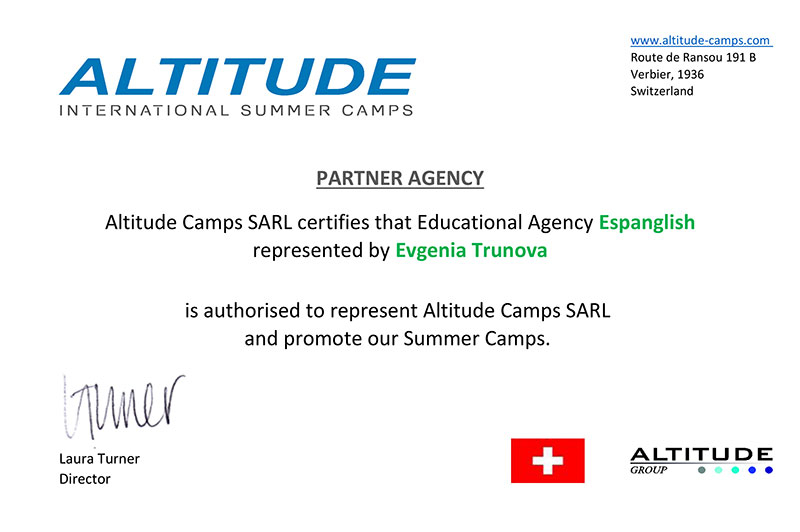 Организация Altitude была основана в 2001 году, как школа лыжного спорта и сноуборда. Много лет спустя, пройдя долгий путь развития, Altitude предлагает теперь уроки катания на лыжах и на сноуборде, курсы подготовки инструкторов в зимнее время, а также же знаменитые международные лагеря для детей и подростков в течение летних каникул.