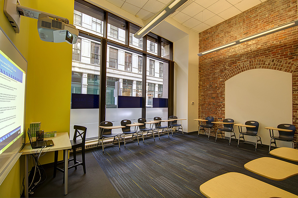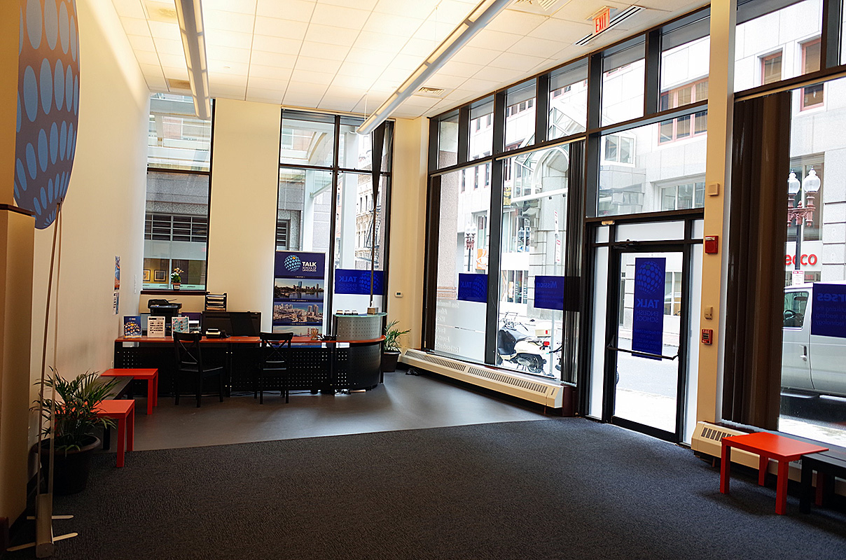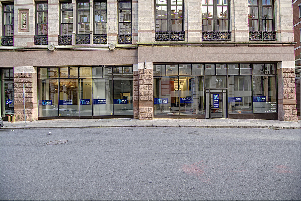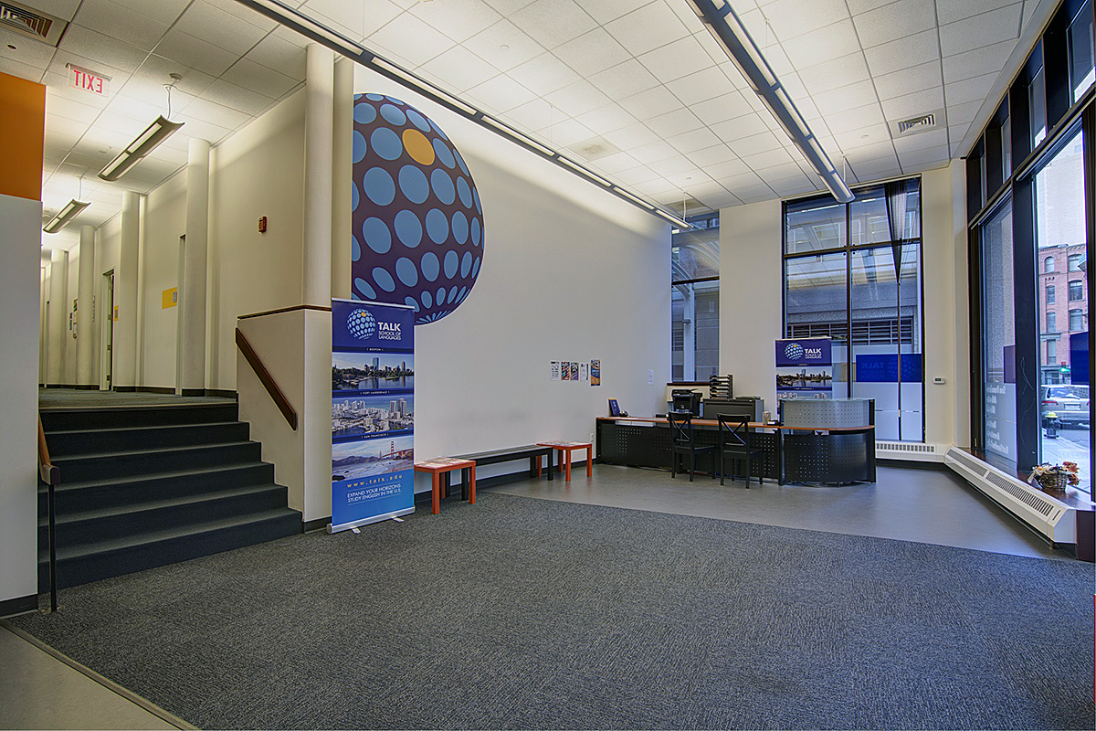 Учебный центр TALK в Бостоне расположен в историческом здании Bedford Building, которое обладает интересным дизайном в стиле лофт. В здании - 10 просторных аудиторий с естестественным освещением и современной мебелью, на занятиях используются интерактивные технологии, кроме того, студенты могут отдохнуть после занятий в большой и уютной зоне отдыха. На территории школы работает бесплатный Wi-Fi, парковка - за отдельную плату. В ближайшей доступности к школе расположены многие кафе, торговые центры, рестораны, остановки общественного транспорта. Стоит также отметить, что от школы можно дойти пешком до исторической части города, улицы Newbury Street и площади Copley Square.