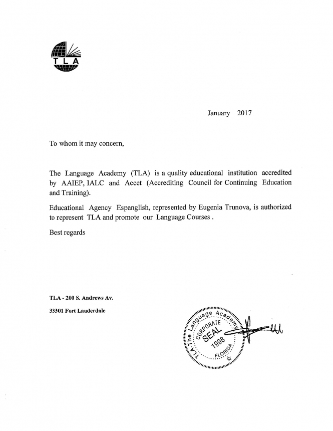 The Language Academy (TLA) - это одна из лидирующих школ в США, которая специализируются на преподавании английского языка студентам от 16 лет, а также бизнесменам и топ-менеджерам. Школа TLA была создана в 1997 году в городе Форт-Лодердейл, штат Флорида, США.