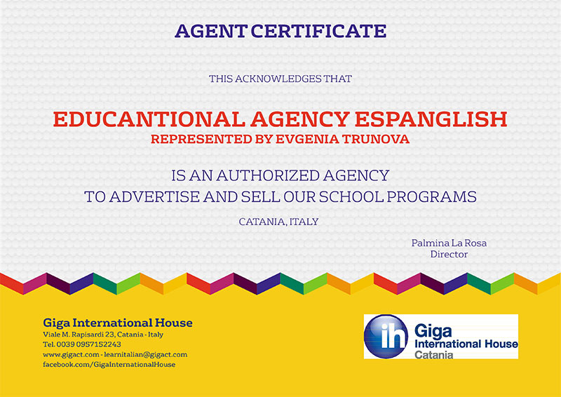 Языковой центр Giga International House Catania был основан в 1997 году и на сегодняшний момент обладает множеством аккредитаций и является членом многих международных организаций. Giga International House Catania - одна из немногих языковых школ, которая признается Министерством образования Италии (Ратификация № 2681/1 of 8/2/00) и является активным членом Italian Association of Language Schools (AISLi), а также аккредитованным центром для подготовки и сдачи таких международных экзаменов как IELTS, Cambridge English Language Assessment exams, Occupational English Test (OET), CELTA (Certificate in English Language Teaching to Adults). Giga IH аккредитован Университетом Сиены для подготовки и сдачи DITALS (Didattica dell'Italiano come Lingua Straniera) и CILS. В 2013 году Giga IH получил сертификат качества ISO 9001:2008. С 2014 года школа входит в состав всемирно известной сети языковых школ International House, которая представлена в 50 странах мира и предлагает только качественные программы по изучению иностранного языка.