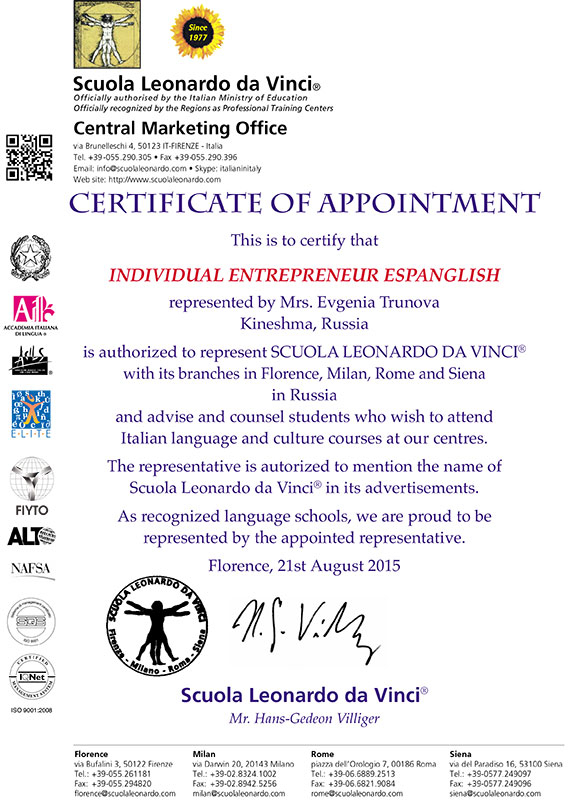 Флоренцию называют родиной Ренессанса. Школа Леонардо ДаВинчи во Флоренции расположена на исторической площади в самом сердце города, с потрясающим видом на Кафедральный Собор. Все самые известные и самые красивые места Флоренции находятся в шаговой доступности.