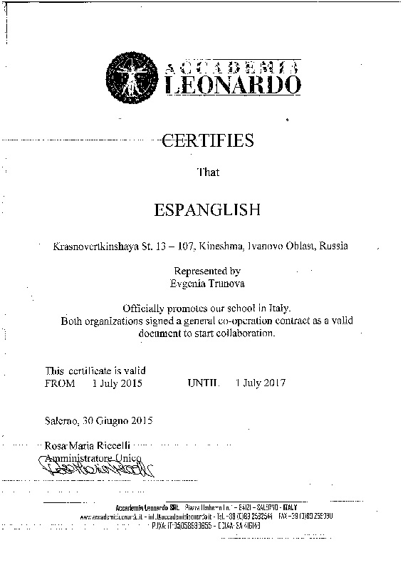 Школа имеет аккредитации местных органов образования г. Салерно, CSN, а также является уполномоченным центром проведения экзаменов CILS и DITALS.