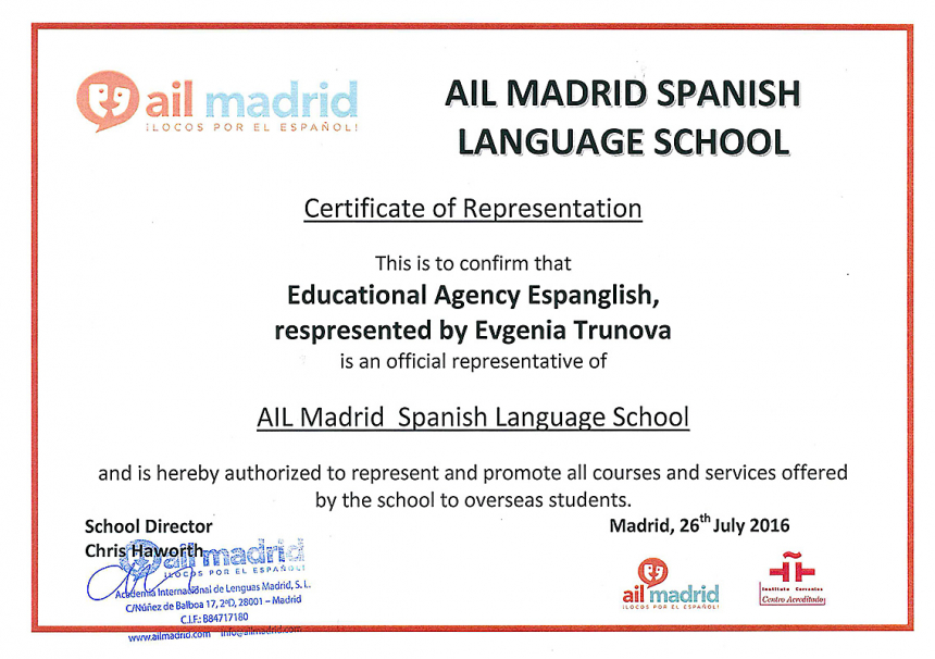 Языковая школа AIL Madrid в Мадриде имеет множество аккредитаций, среди которых: аккредитация Института Сервантеса, FEDELE, AEEEM, Торговая Палата Мадрида, Итальянская торговая Палата, немецкая аккредитация Bildungsurlaub.