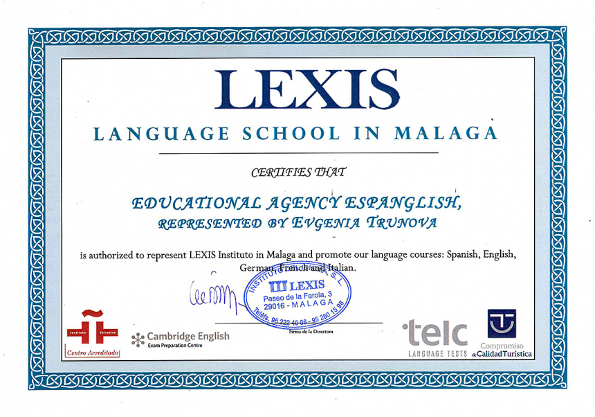 LEXIS Instituto аккредитована такими образовательными организациями, как Институт Сервантеса, A.C.E.M (Asociación de Centros de Español de Málaga, Compromiso de Calidad Turística), что является гарантией высокого качества преподавания иностранных языков.
