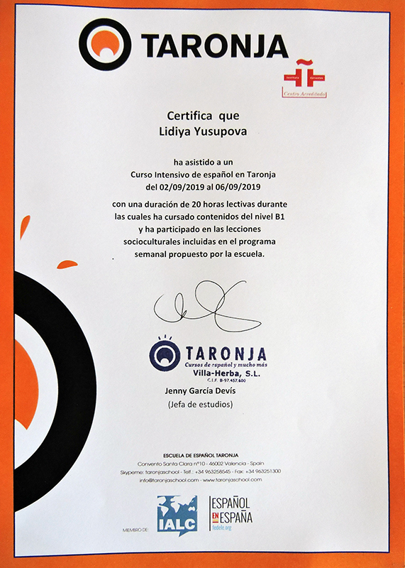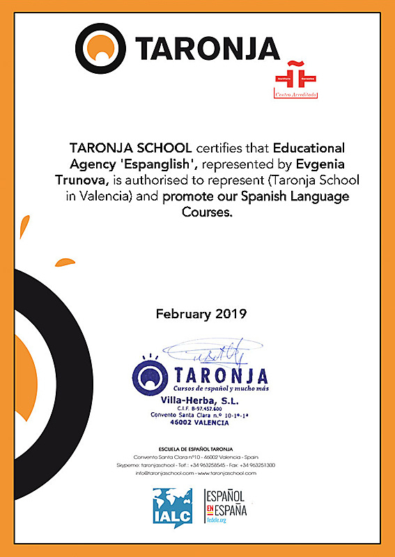 Школа испанского языка Taronja в Валенсии имеет аккредитацию Института Сервантеса, что говорит о высоком качестве преподавания испанского языка, квалификации преподавателей и достойных условиях для студентов. Школа также является членом Ассоциации Школ Иностранных Языков (IALC), Ассоциации Школ Испанского языка как иностранного (FEDELE), СSN, а также признана Правительством Валенсии.
