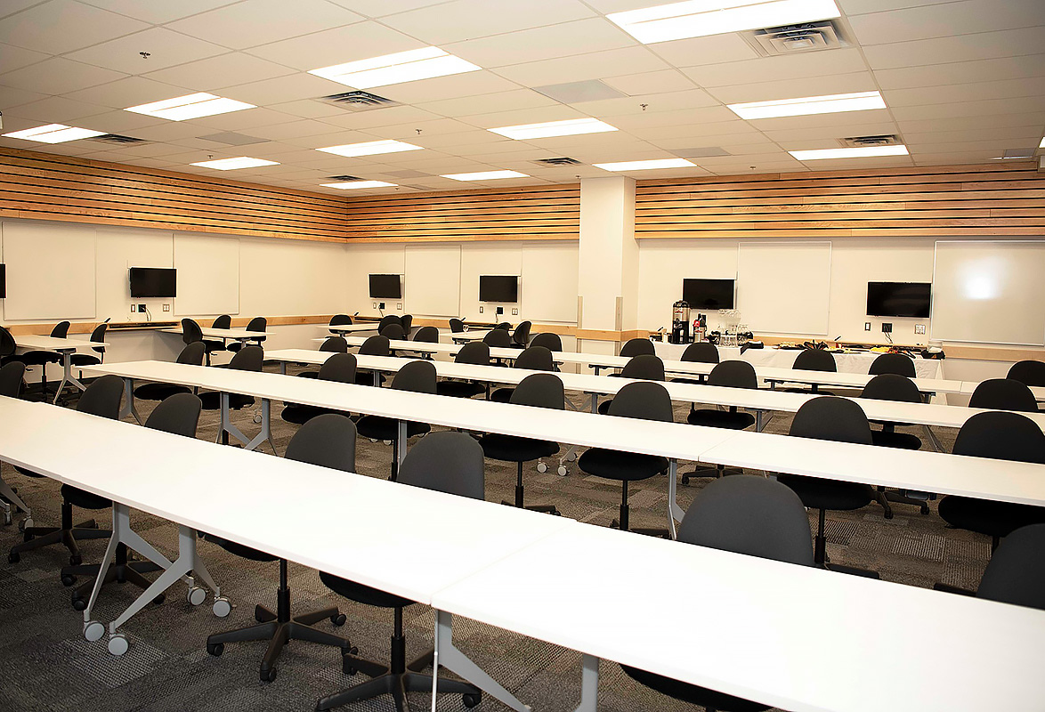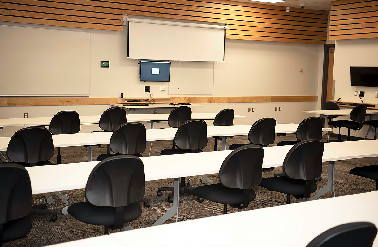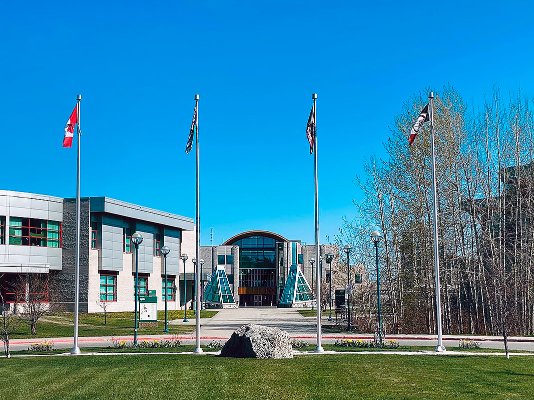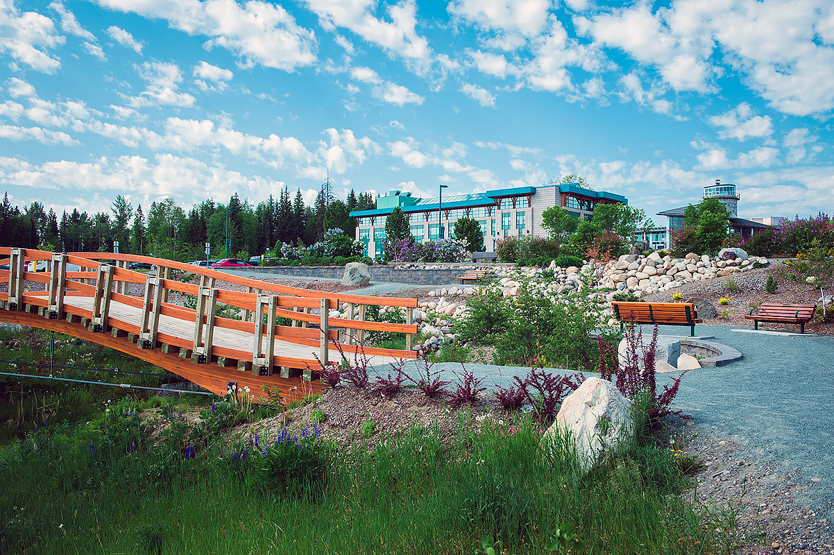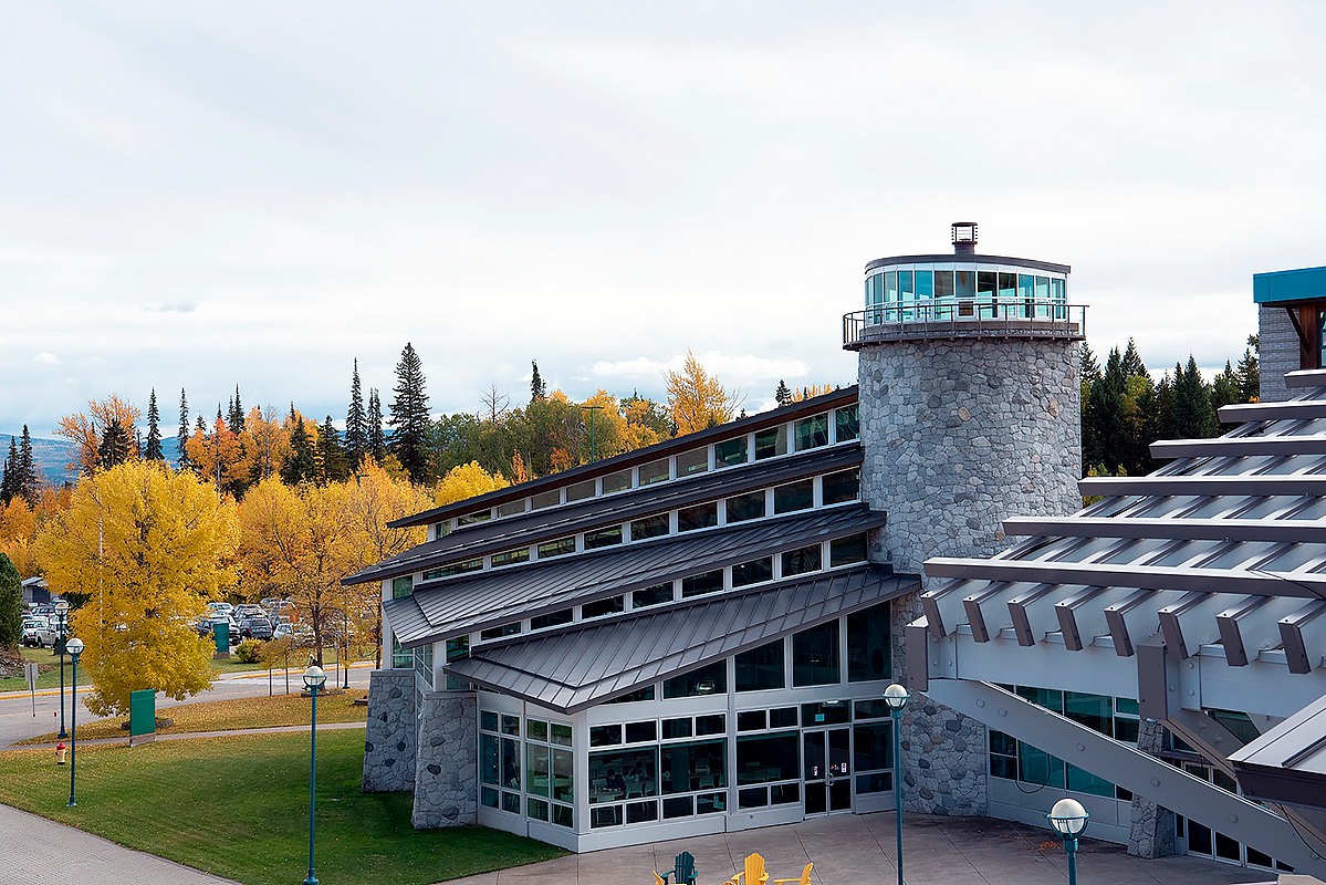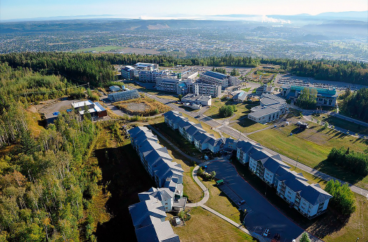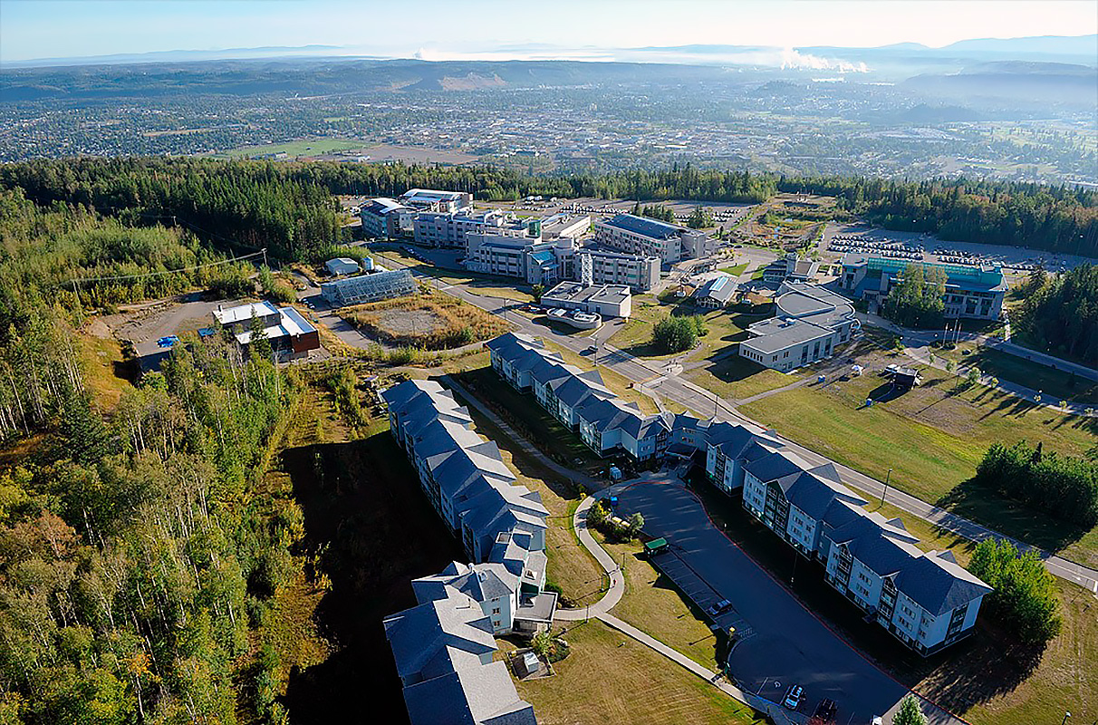 Сам кампус расположен в крупнейшем городе севера Британской Колумбии, где находится множество парков и зеленых пространств. Рядом с ним располагается ботанический сад David Douglas.
