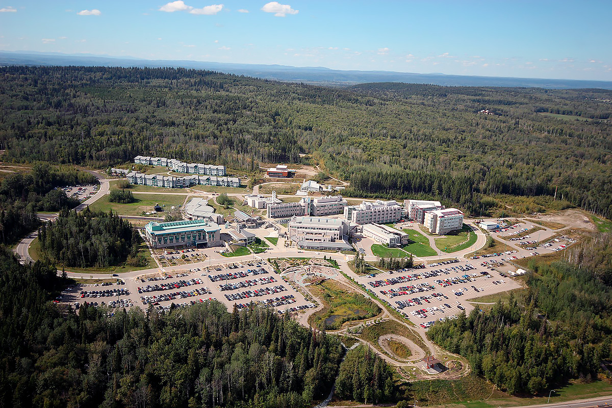 Главный кампус университета находится в городе Принс-Джордж. Один из самых выдающихся объектов инфраструктуры вуза – Центр инноваций и дизайна лесоматериалов. Это самое высокое деревянное здание в мире, в котором располагается факультет деревообрабатывающий промышленности и научная лаборатория по изучению лесоматериалов. Также университету принадлежит госпиталь с собственным центром травматологии. В кампусе расположен зимний сад, кафетерий и собственный книжный магазин. Другие филиалы учебного заведения находятся в городах Принс-Руперт, Квеснел, Форт Сент-Джон.